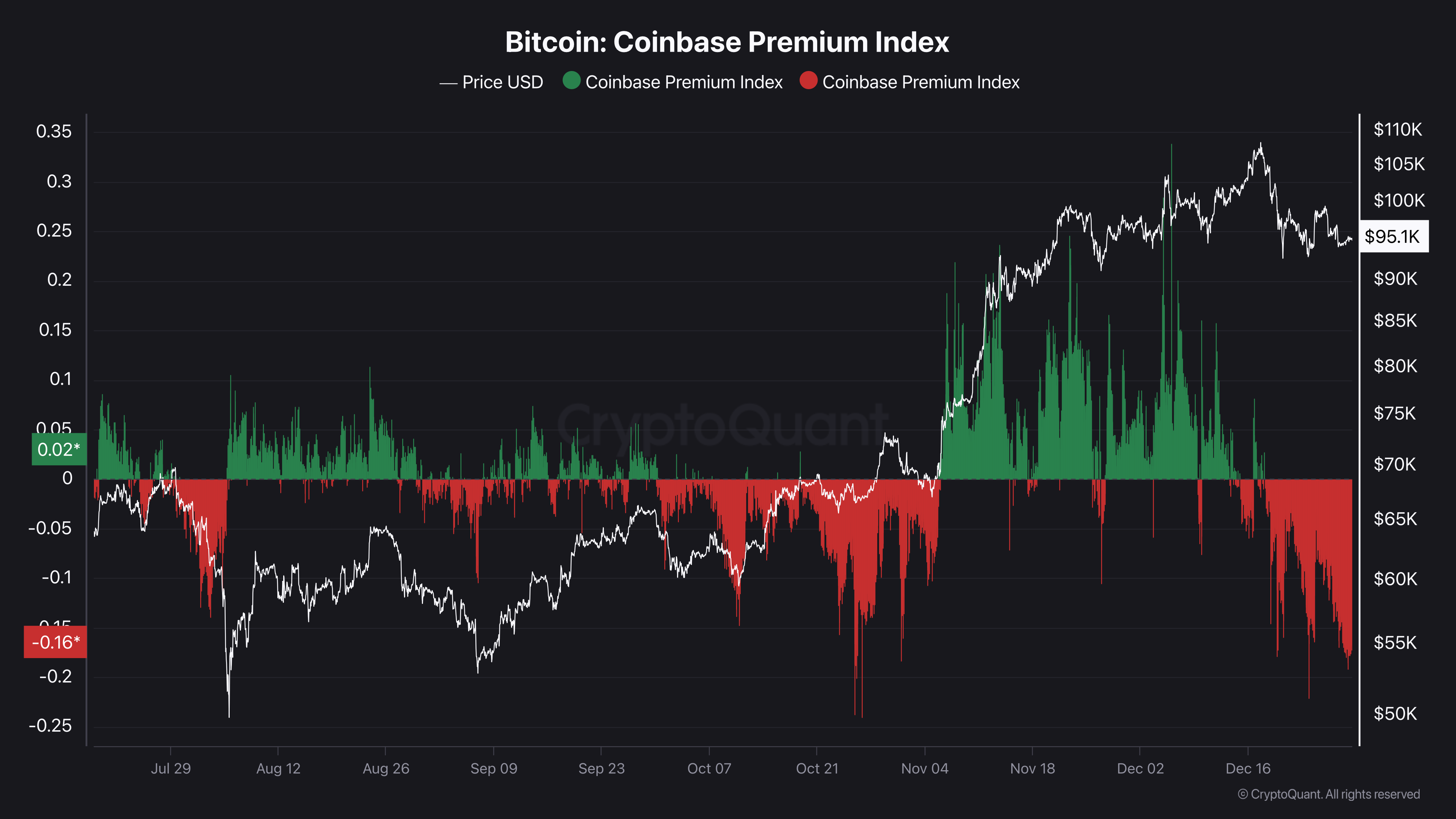 The Coinbase Premium Index highlights the significant role of U.S. institutional players in shaping Bitcoin’s price movements. The pronounced positive premium during Bitcoin’s rise underscores robust institutional demand, whereas the negative premium in December signals caution, coinciding with market consolidation near $95K. Future shifts in the Coinbase Premium Index will remain a critical indicator for gauging institutional sentiment and potential price direction.
