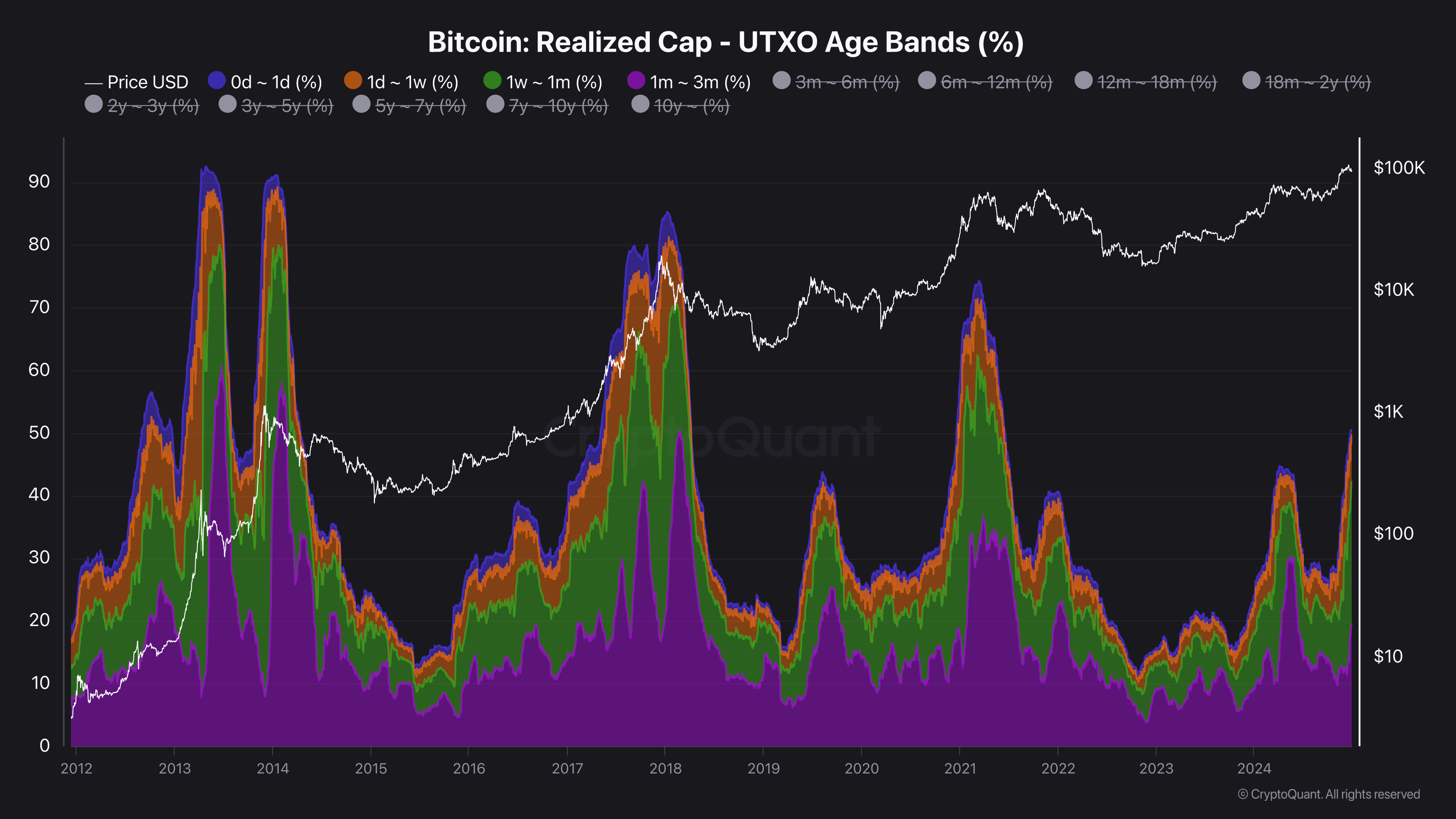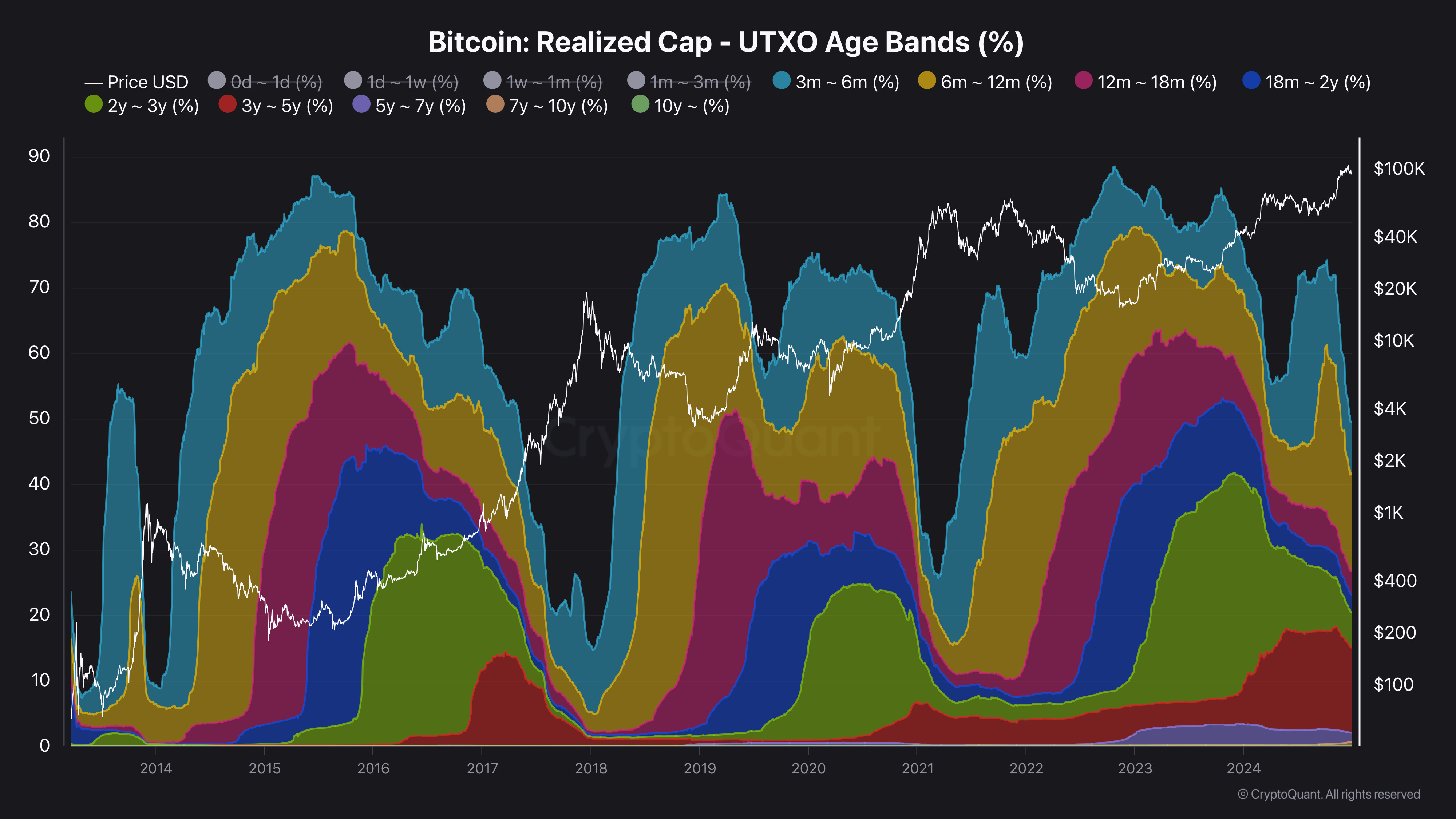 • Younger UTXO bands (e.g., 1 day–3 months) have increased dominance in recent months, signaling heightened retail participation and FOMO-like behavior.