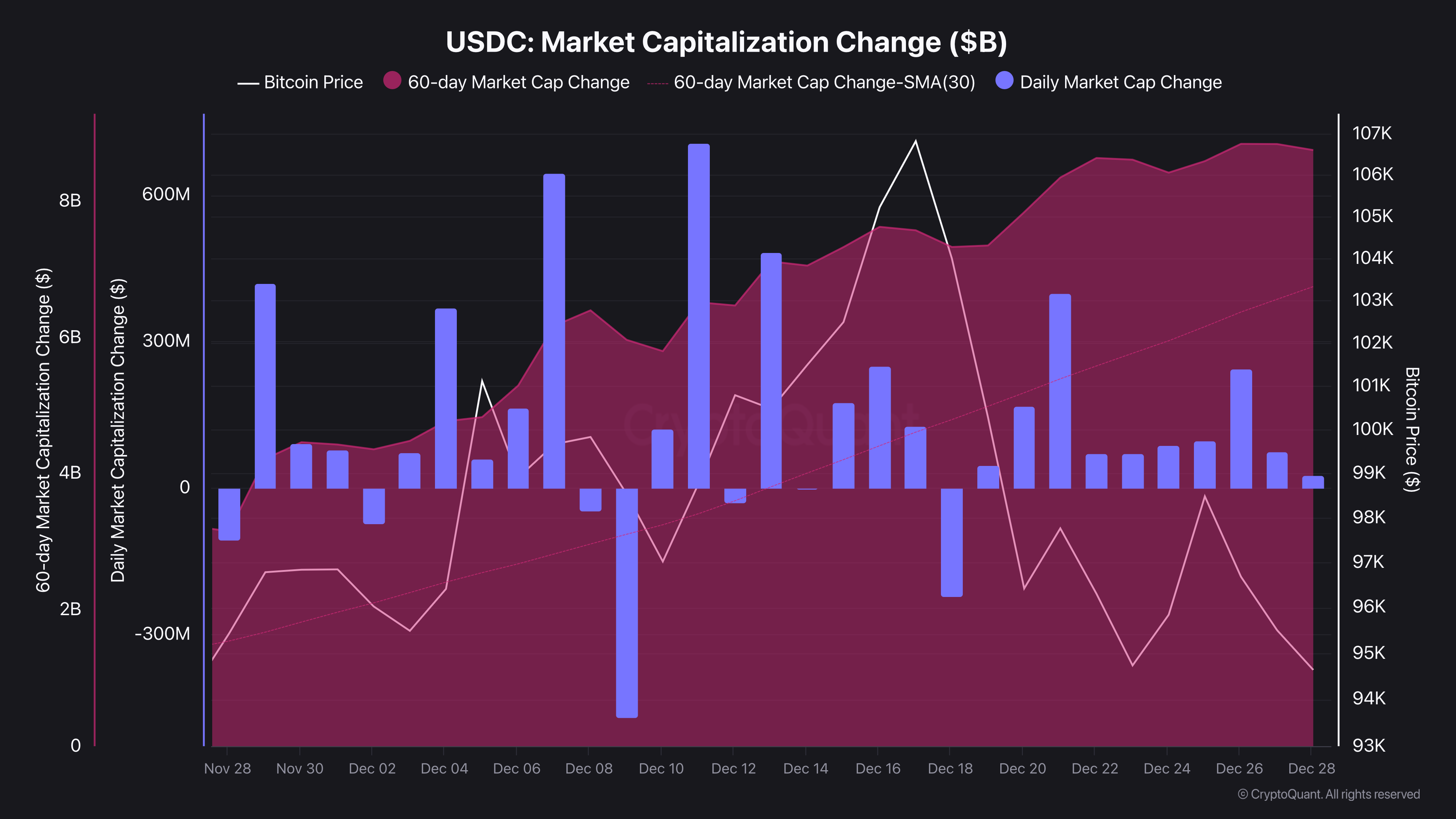 Net Market Cap Change: Over the same period, USDC experienced a net increase of +603.56M USD, reflecting consistent and moderate inflows.