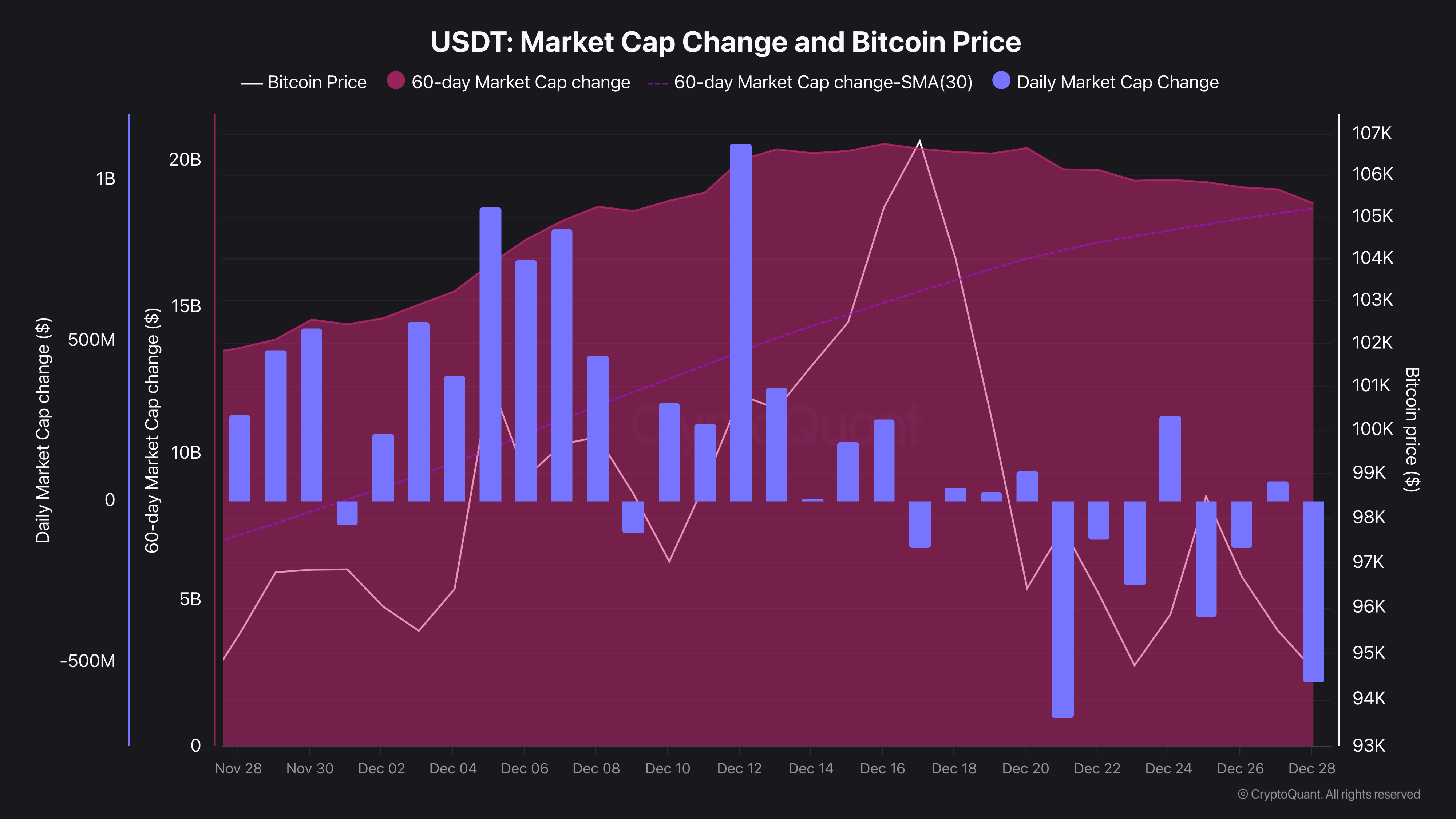 Conversely, declining stablecoin market capitalization often signals increased crypto selling and lower liquidity, potentially leading to Bitcoin price decreases.USDT Market Cap Analysis (23-28 December 2024):