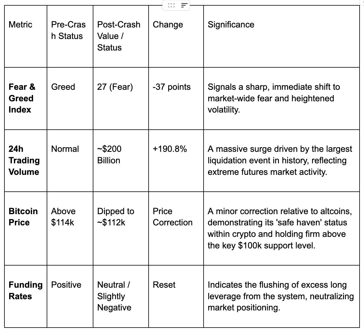 The crash triggered an immediate and dramatic shift across several key market indicators, reflecting a violent purge of speculative excess and a rapid transition to a state of fear.