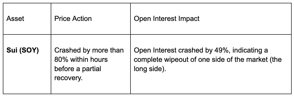 The magnitude of these drops, especially in altcoins like Sui which saw nearly half its open interest evaporate in hours, cannot be explained by the tariff news alone. This data provides unequivocal evidence of a leverage-driven cascade where forced selling triggered more forced selling in a self-reinforcing downward spiral.